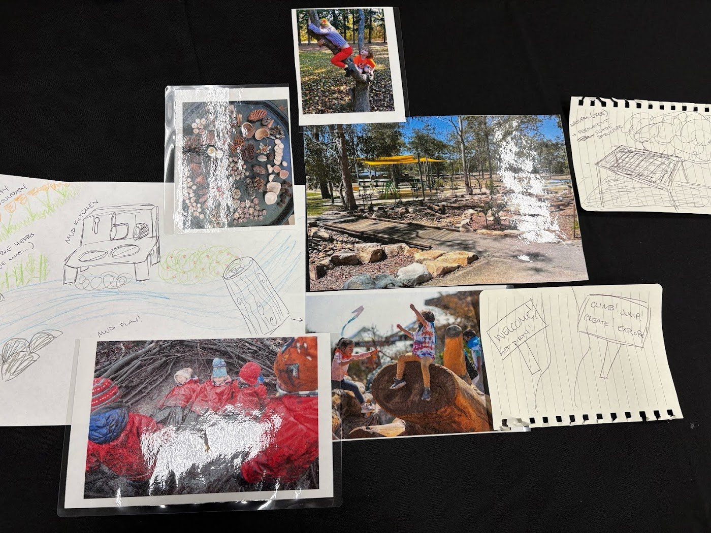 Based on the learnings from this session, we drew in other elements that can make nature play spaces even more welcoming to young children and their families, like mud kitchens, shade structures and inviting signs.